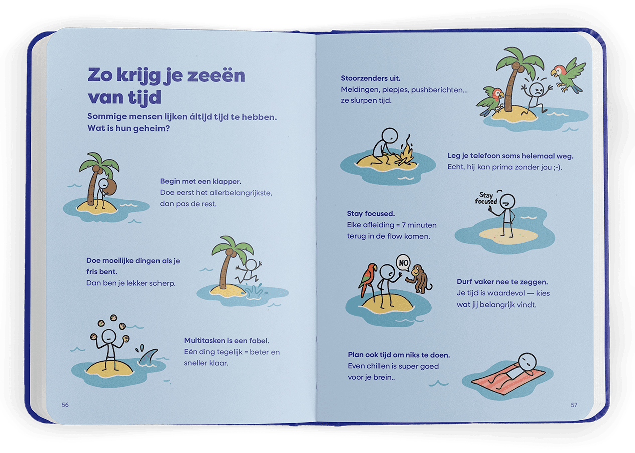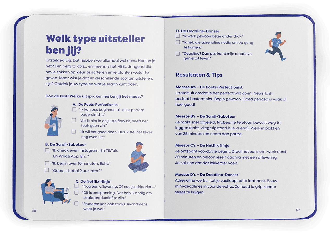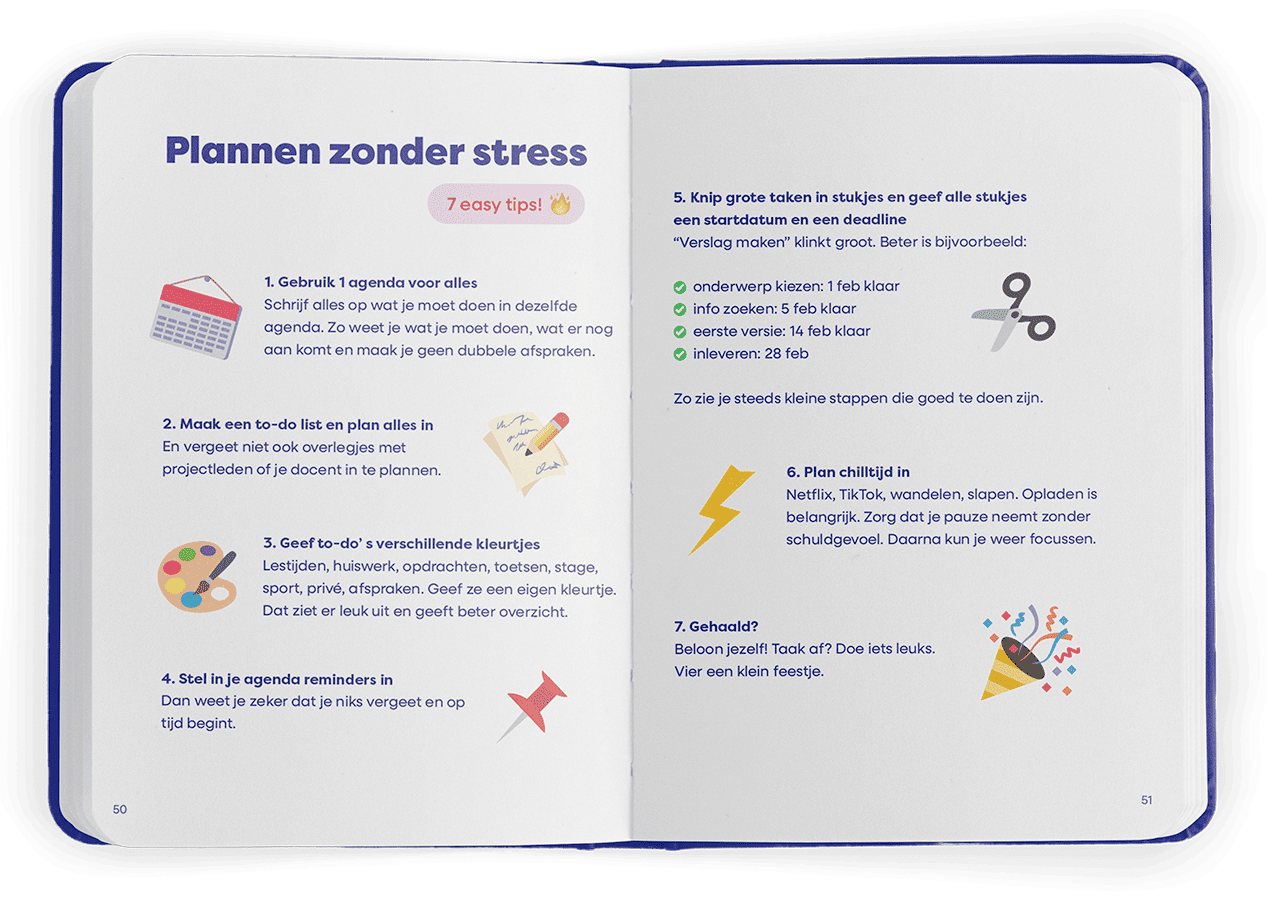 De inhoud sluit aan bij wat studenten in de startfase nodig hebben: praktische tips, inspiratie en ruimte voor reflectie. In toegankelijke vorm komen thema’s als plannen, studievaardigheden, samenwerken en eigen regie langs. Verder bevat de pocket leuke testjes, checklists en een flinke dosis humor. Daarnaast geven de verhalen van medestudenten naast praktische tips, ook een inkijkje in het brede scala van mogelijkheden op het gebied van carrière en vervolgstudies.